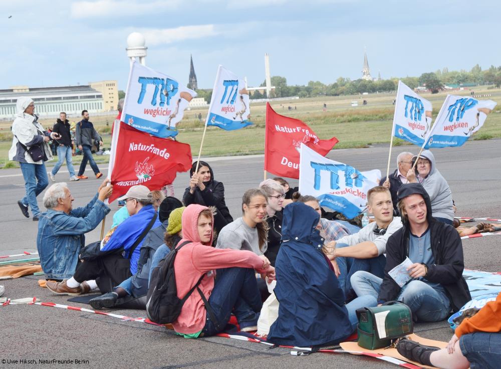 Ein buntes menschliches Mosaik und ein Schriftzug mit klarer Ansage – das war das Ziel des sogenannten "TTIPsitin" am Samstag, dem 5. September, in Berlin. Mehr als 1.500 Menschen waren dem Aufruf des Berliner STOPP-TTIP Bündnisses gefolgt, dem auch die NaturFreunde Berlin angehören, und auf dem ehemaligen Gelände des Flughafens Tempelhof zusammengekommen. Mit Picknick-Decken, Bannern und Fahnen formten sie dann 20 Meter hohe Buchstaben, die den Slogan "STOPP TTIP CETA TiSA" bildeten.